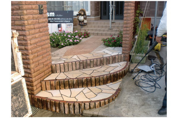 階段 レンガ+天然石